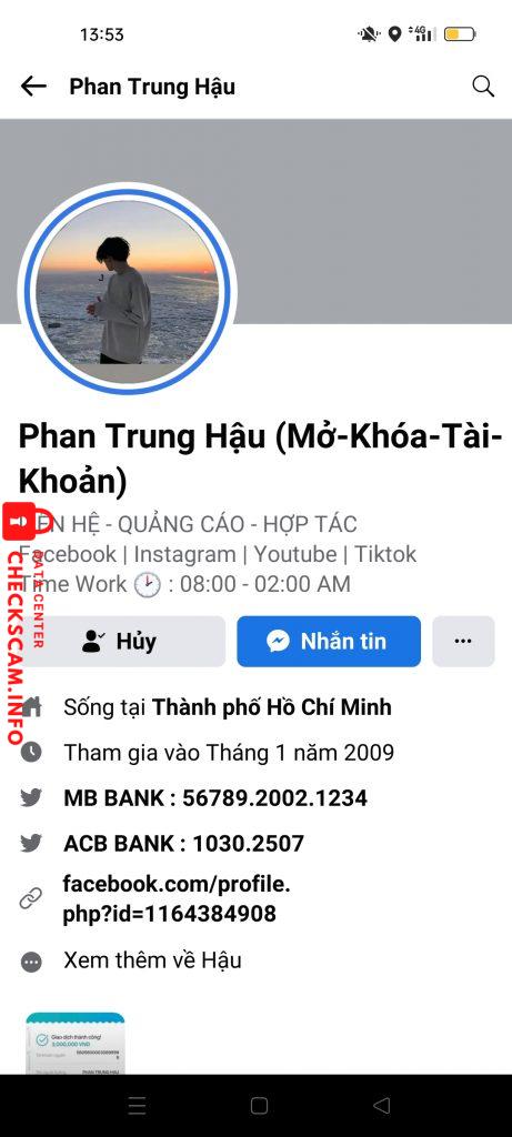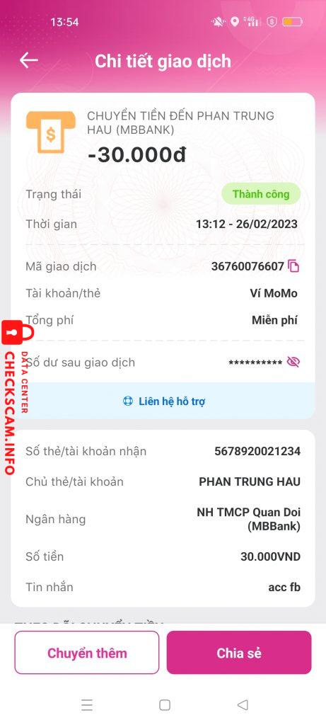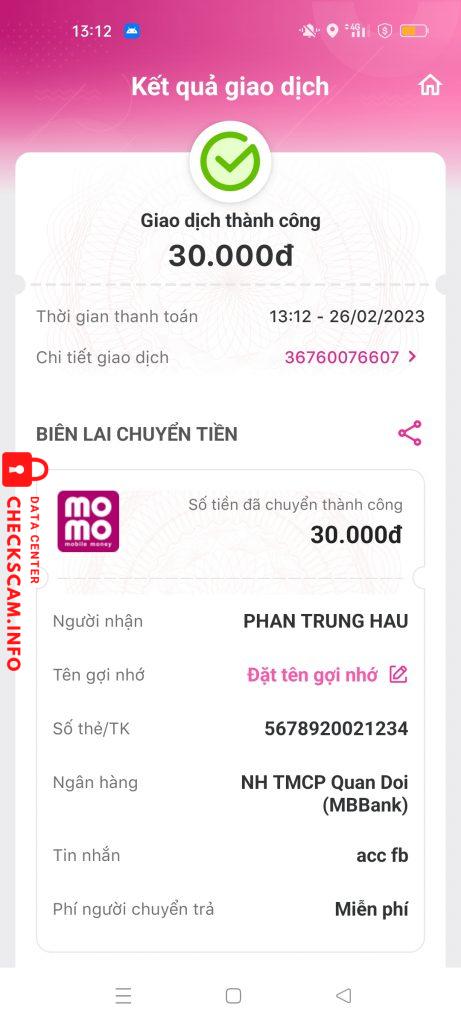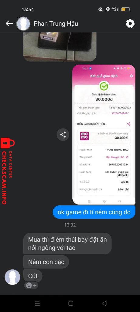 Scammer Alert: PHAN TRUNG HAU Reported: November 16, 2024 Scammer Information Full Name: PHAN TRUNG HAU Payment Gate: MB Bank Payment Account: 5678920021234 Category: Marketplace scams Source: Checkscam Evidence Files Report Description bán acc scam gần 400 Comments Your comment Add Comment No comments yet. Be the first to share your experience with this scammer.