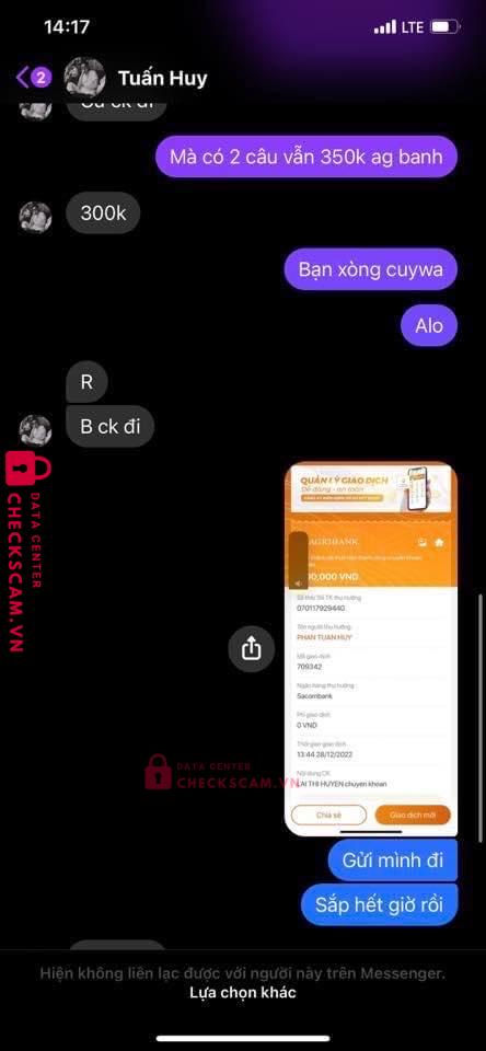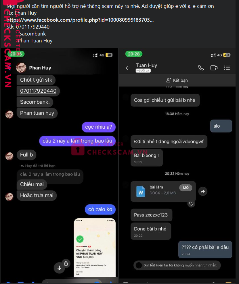 Scammer Alert: Phan Tuấn Huy Reported: November 16, 2024 Scammer Information Full Name: Phan Tuấn Huy Payment Gate: Sacombank Payment Account: 070117929440 Category: Marketplace scams Source: Checkscam Evidence Files Report Description Nhận làm bài hộ nhưng khi bank tiền xong thì không gửi bài và block Comments Your comment Add Comment No comments yet. Be the first to share your experience with this scammer.