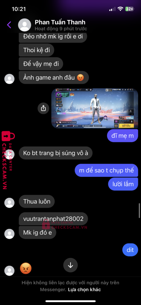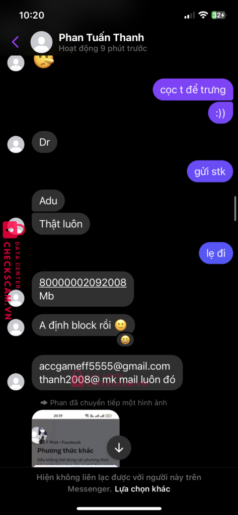 Scammer Alert: PHAN TUAN THANH Reported: November 16, 2024 Scammer Information Full Name: PHAN TUAN THANH Payment Gate: MB bank Payment Account: 80000002092008 Category: Marketplace scams Source: Checkscam Evidence Files Report Description con chó này bán acc rồi back lại ae né thằng PHAN TUẤN THANH Comments Your comment Add Comment No comments yet. Be the first to share your experience with this scammer.