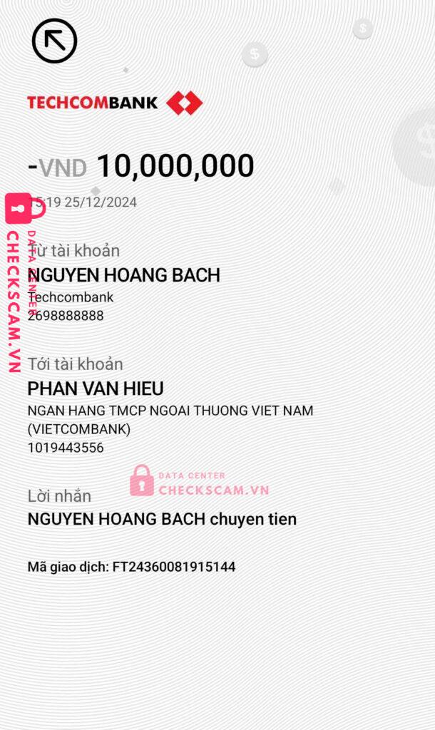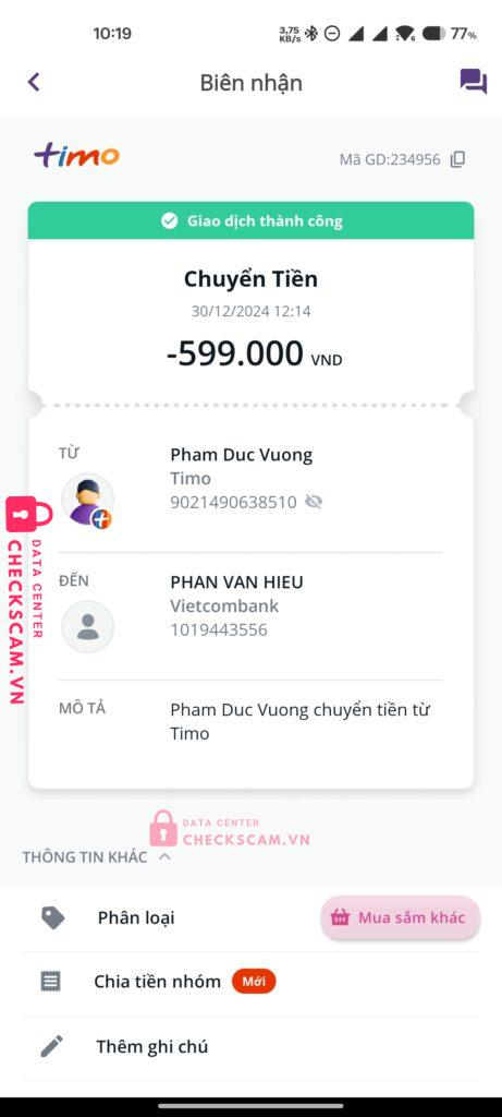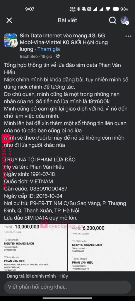 Scammer Alert: Phan Van Hieu Reported: March 7, 2025 Scammer Information Full Name: Phan Van Hieu Payment Gate: VIETCOMBANK Payment Account: 1019443556 Category: Marketplace scams Source: Checkscam Evidence Files Report Description Lừa đảo, bán sim dùng được vài hôm xong khoá + chặn người mua Comments Your comment Add Comment No comments yet. Be the first to share your experience with this scammer.