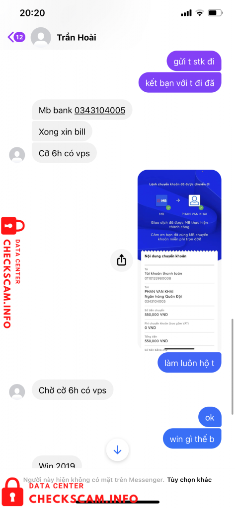 Scammer Alert: Phan Van Khai Reported: November 16, 2024 Scammer Information Full Name: Phan Van Khai Phone Number: 0343104005 Payment Gate: MB bank Payment Account: 0343104005 Category: Marketplace scams Source: Checkscam Evidence Files Report Description Scam bán VPS ( máy ảo ) Comments Your comment Add Comment No comments yet. Be the first to share your experience with this scammer.