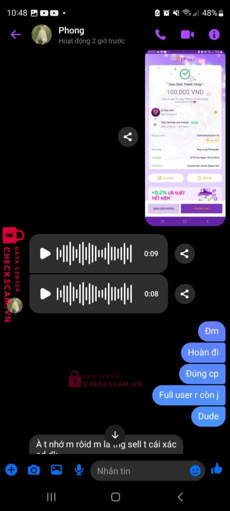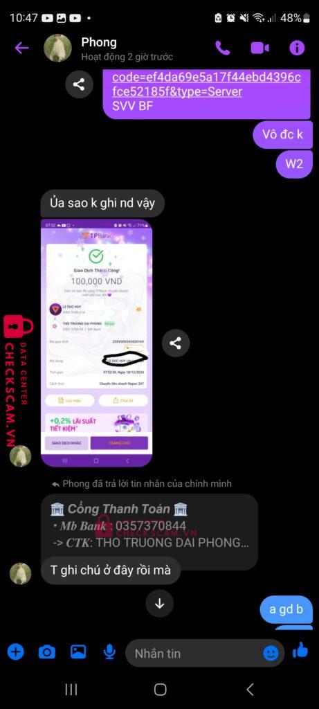 Scammer Alert: Phong Bar Reported: March 7, 2025 Scammer Information Full Name: Phong Bar Payment Gate: MB bank Payment Account: 0357370844 Category: Marketplace scams Source: Checkscam Evidence Files Report Description Mua đồ xong rồi nó sẽ bảo sai nd gd, xong rồi mình chuyển thêm tiền để nó trả và đúng nd gd của bó nói lại bảo là nd gd là huy gd phong Comments Your comment Add Comment No comments yet. Be the first to share your experience with this scammer.
