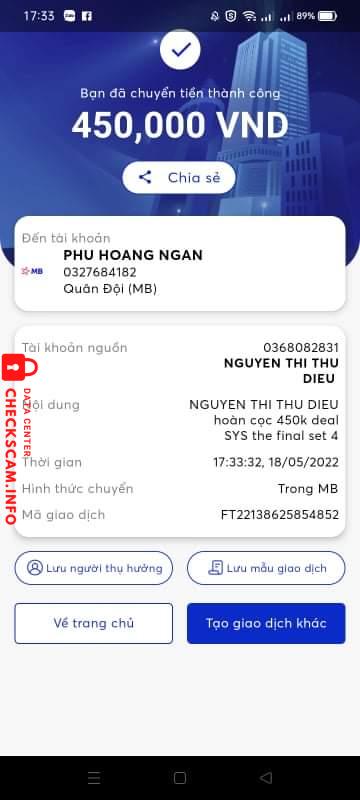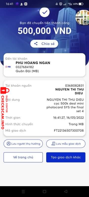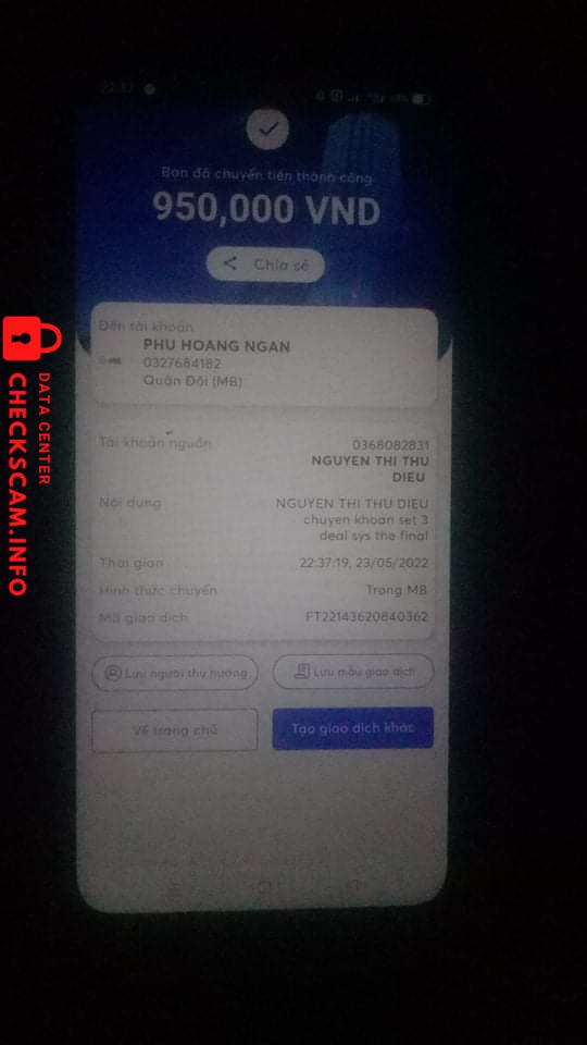 Scammer Alert: PHU HOANG NGAN Reported: November 16, 2024 Scammer Information Full Name: PHU HOANG NGAN Phone Number: 0327684182 Payment Gate: Mb bank Payment Account: 0327684182 Category: Marketplace scams Source: Checkscam Evidence Files Report Description Tội bị bạn này scam 1m9 và bạn ấy block tôi nên tin nhắn cũng bị mất luôn Comments Your comment Add Comment No comments yet. Be the first to share your experience with this scammer.