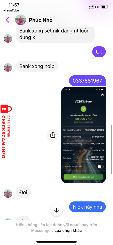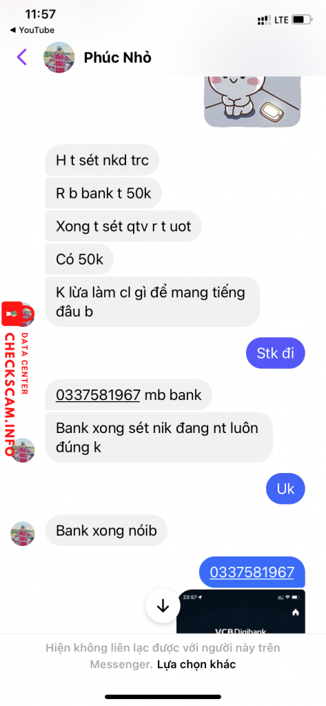 Scammer Alert: Phúc nhỏ Reported: November 16, 2024 Scammer Information Full Name: Phúc nhỏ Phone Number: 0337581967 Payment Gate: Mb bank Payment Account: 0337581967 Category: Marketplace scams Source: Checkscam Evidence Files Report Description Lừa đảo group fb Comments Your comment Add Comment No comments yet. Be the first to share your experience with this scammer.