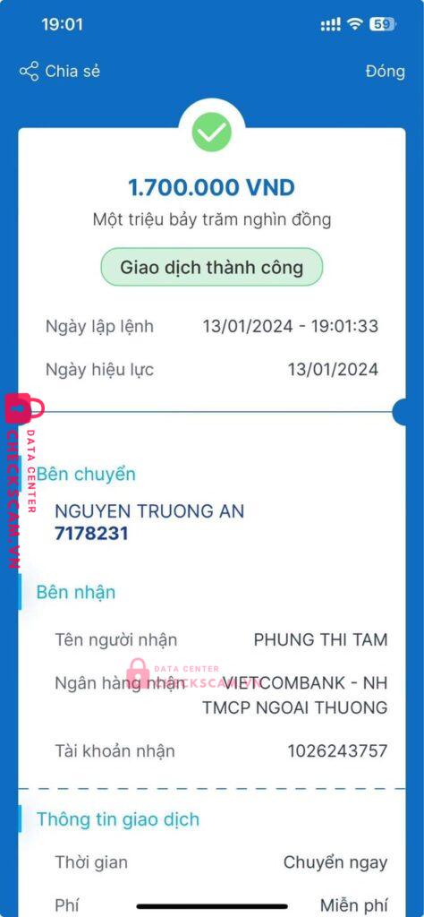 Scammer Alert: PHUNG THI TAM Reported: November 16, 2024 Scammer Information Full Name: PHUNG THI TAM Payment Gate: VIETCOMBANK Payment Account: 1026243757 Category: Marketplace scams Source: Checkscam Evidence Files Report Description Trao đổi mua máy đọc sách Kindle paperwhite 5, giá 1tr7. Sau khi chuyển khoản thì hủy đơn vận chuyển và block liên lạc. Comments Your comment Add Comment No comments yet. Be the first to share your experience with this scammer.
