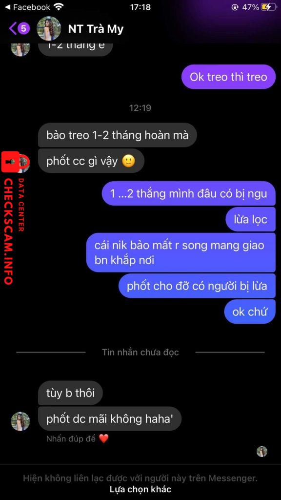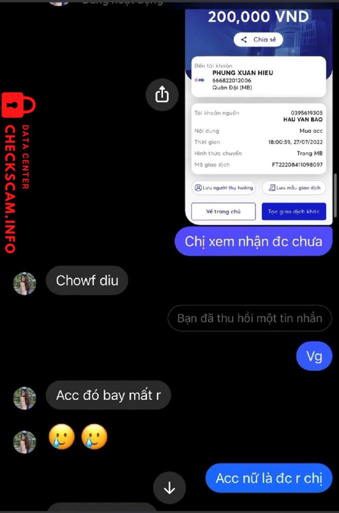 Scammer Alert: PHÙNG XUÂN HIẾU Reported: November 16, 2024 Scammer Information Full Name: PHÙNG XUÂN HIẾU Payment Gate: MBANK Payment Account: 9899999699 Category: Marketplace scams Source: Checkscam Evidence Files Report Description Mua nick 450k Chuyển khoản xong chặn Block Mong admin xử lí giúp Comments Your comment Add Comment No comments yet. Be the first to share your experience with this scammer.