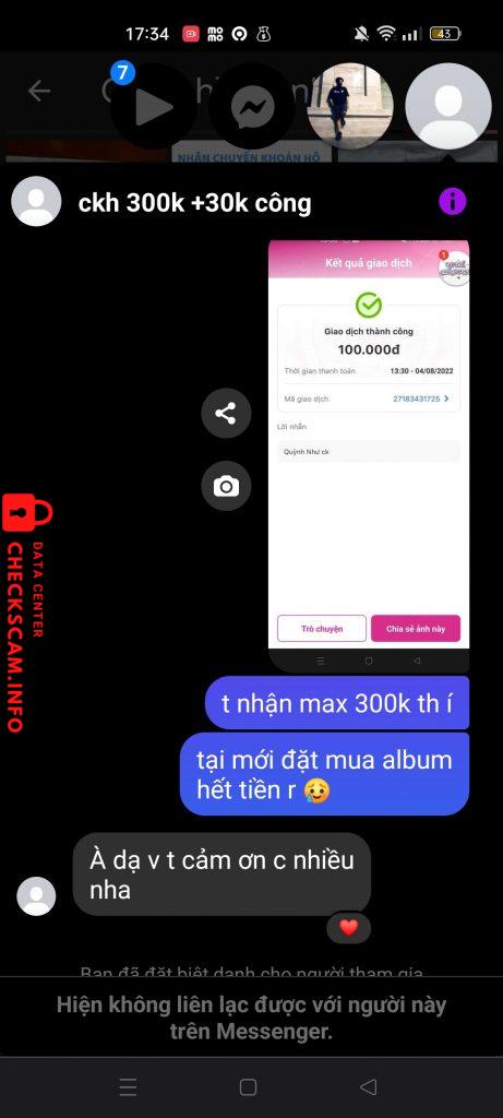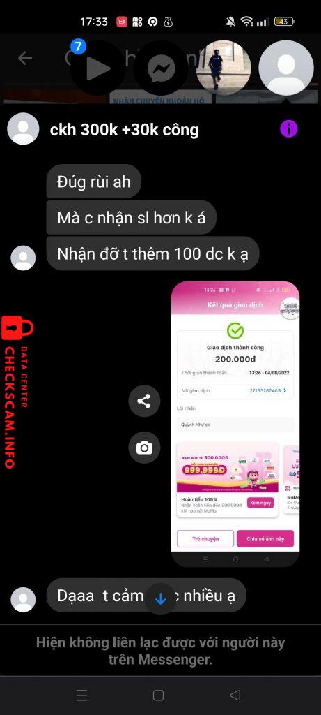 Con này ăn cắp thông tin người khác và nhờ chuyển khoản hộ và lừa tôi hết 300k, đã block Facebook, Mess, Momo, tin nhắn đth nên k thể lấy lại được tiền và cũng k có biết thêm thông tin gì vì con này hết.