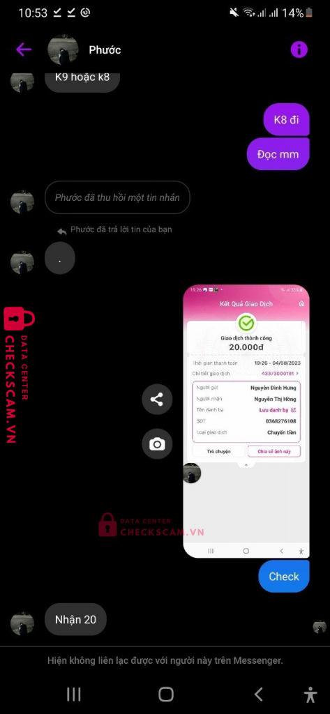 Scammer Alert: Phước Reported: November 16, 2024 Scammer Information Full Name: Phước Phone Number: 03682761028 Payment Gate: Momo Payment Account: 03682761028 Category: Marketplace scams Source: Checkscam Evidence Files Report Description coi như bố thí 20k ạ, vì cái lợi trước mắt mà mất uy tín lâu dài Comments Your comment Add Comment No comments yet. Be the first to share your experience with this scammer.