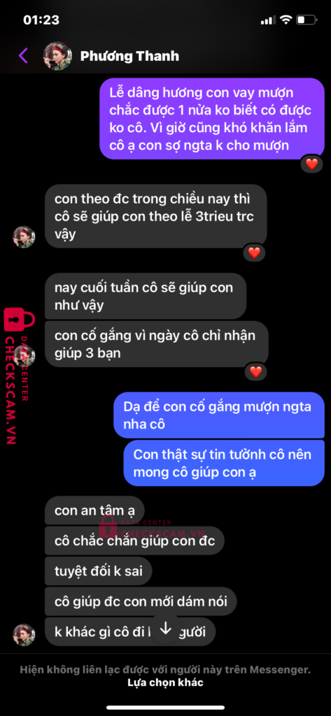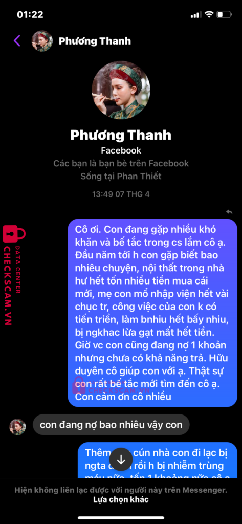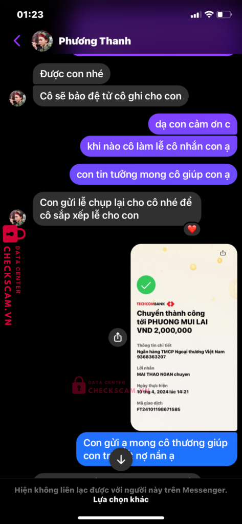 Scammer Alert: PHUONG MUI LAI Reported: November 16, 2024 Scammer Information Full Name: PHUONG MUI LAI Payment Gate: Vietcombank Payment Account: 9368363207 Category: Marketplace scams Source: Checkscam Evidence Files Report Description Hầu đồng lợi dụng lòng tin của nhiều người đang gặp khó khăn để lừa đảo. Em đang nợ nần nên đánh liều xin lộc và bị lừa thêm 1 cú nữa. Comments Your comment Add Comment No comments yet. Be the first to share your experience with this scammer.