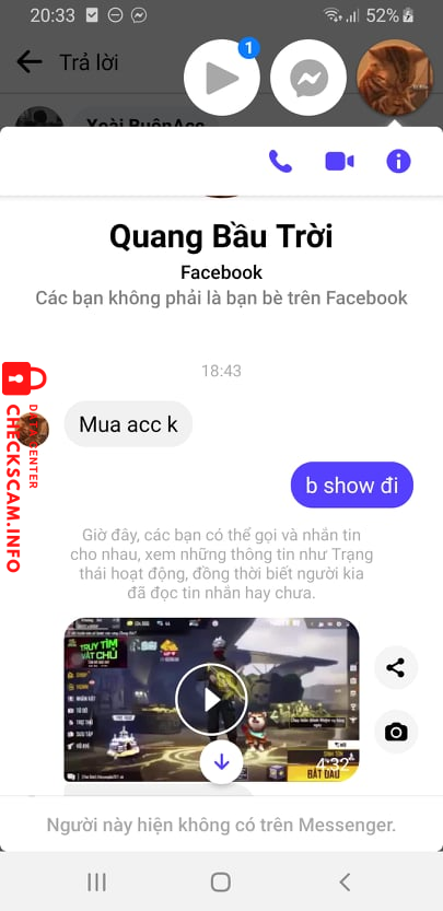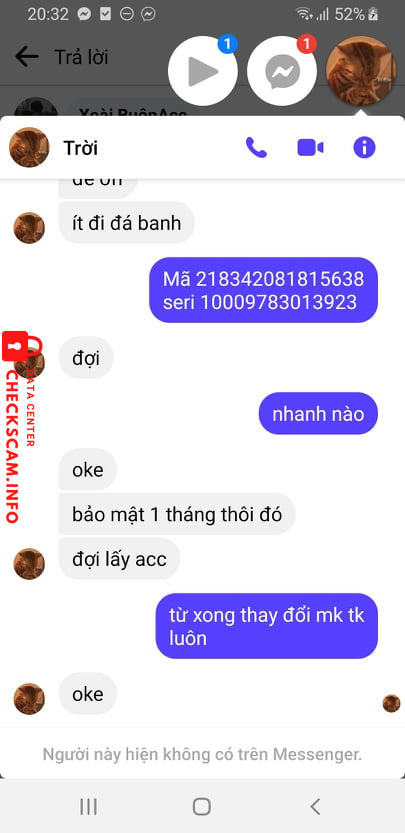 Scammer Alert: Quang Bầu Trời Reported: November 16, 2024 Scammer Information Full Name: Quang Bầu Trời Phone Number: 0376294898 Payment Gate: momo Payment Account: 0376294898 Category: Marketplace scams Source: Checkscam Evidence Files Report Description Scam , lừa đảo Comments Your comment Add Comment No comments yet. Be the first to share your experience with this scammer.
