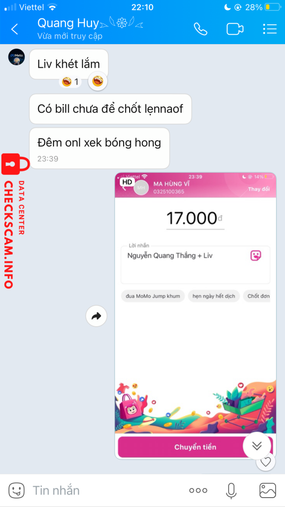 Scammer Alert: Quang Huy Reported: November 16, 2024 Scammer Information Full Name: Quang Huy Phone Number: 0325100365 Payment Gate: Momo Payment Account: 0325100365 Category: Marketplace scams Source: Checkscam Evidence Files Report Description Lừa đảo người khác chiếm đoạt tài sản Comments Your comment Add Comment No comments yet. Be the first to share your experience with this scammer.