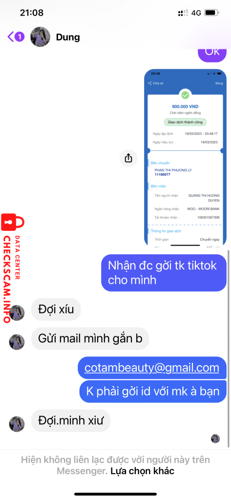 Scammer Alert: QUANG THI HUONG DUYEN Reported: November 16, 2024 Scammer Information Full Name: QUANG THI HUONG DUYEN Payment Gate: Woori bank Payment Account: 100351057306 Category: Marketplace scams Source: Checkscam Evidence Files Report Description Nó lừa mua tk tiktok, ck xong rồi chặn Comments Your comment Add Comment No comments yet. Be the first to share your experience with this scammer.