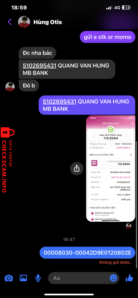 Scammer Alert: Quang van hung Reported: November 16, 2024 Scammer Information Full Name: Quang van hung Payment Gate: MB Payment Account: 5102695431 Category: Marketplace scams Source: Checkscam Evidence Files Report Description scam bán chứng chỉ gbox ae cẩn thận Comments Your comment Add Comment No comments yet. Be the first to share your experience with this scammer.