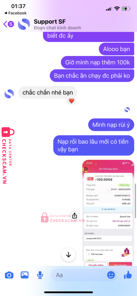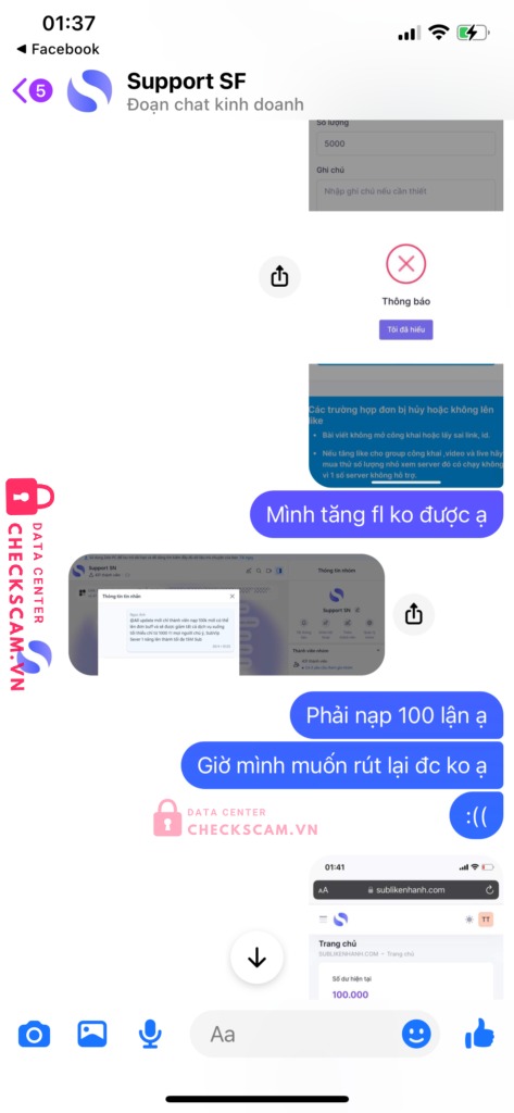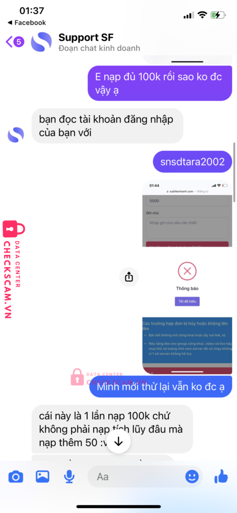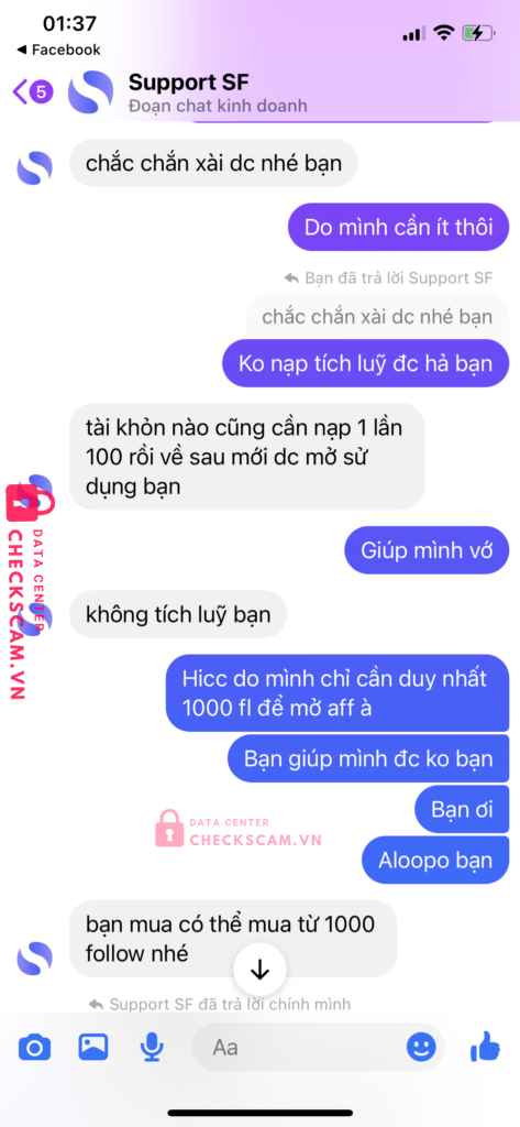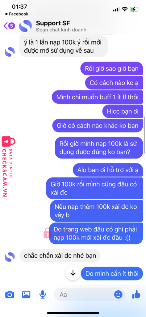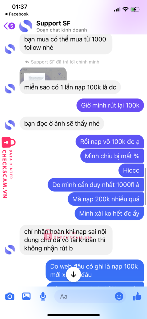 Mình có thấy quảng cáo buff fl nên mình có vào web và nạp tiền, lúc đầu mình nạp 50k thì tạo đơn không được, mình có nhắn chỗ này nó bảo phải nạp được 100k mới buff được, mình nạp thêm 50k tổng cộng là 100k thì vẫn không được, mình nhắn hỏi thì nó bảo là không nạp tích luỹ được, phải nạp đủ 100k 1 lần mới dùng được. Vậy là mình nạp 100k nhưng không hiện thêm trên web (tổng cộng là 200k) mình nhắn hỏi thì không rep 🙂 mình lấy acc phụ ib hỏi về vụ nạp tiền thì nó lại rep. Page này lừa lắm anh em cẩn thận