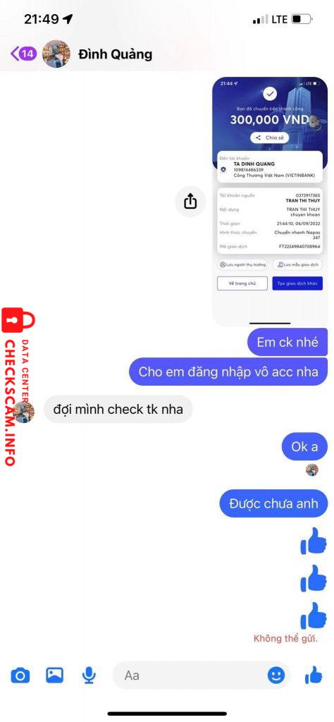 Scammer Alert: Tạ Đình Quang Reported: November 16, 2024 Scammer Information Full Name: Tạ Đình Quang Payment Gate: vietinbank Payment Account: 109874486339 Category: Marketplace scams Source: Checkscam Evidence Files Report Description lừa đảo 600 Comments Your comment Add Comment No comments yet. Be the first to share your experience with this scammer.