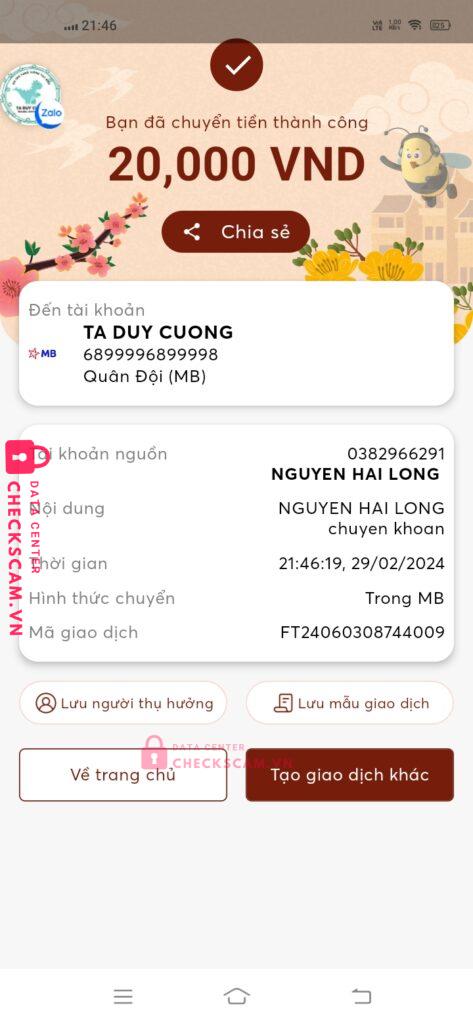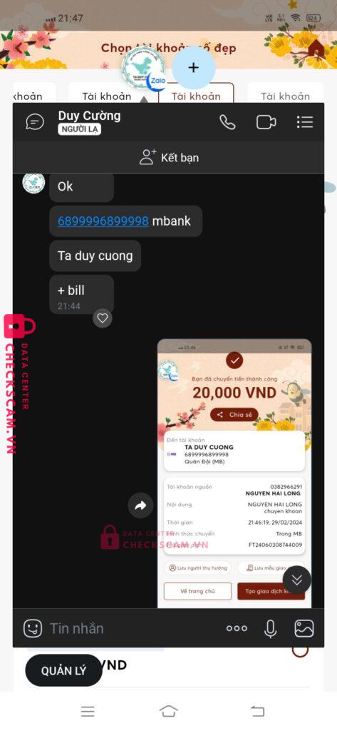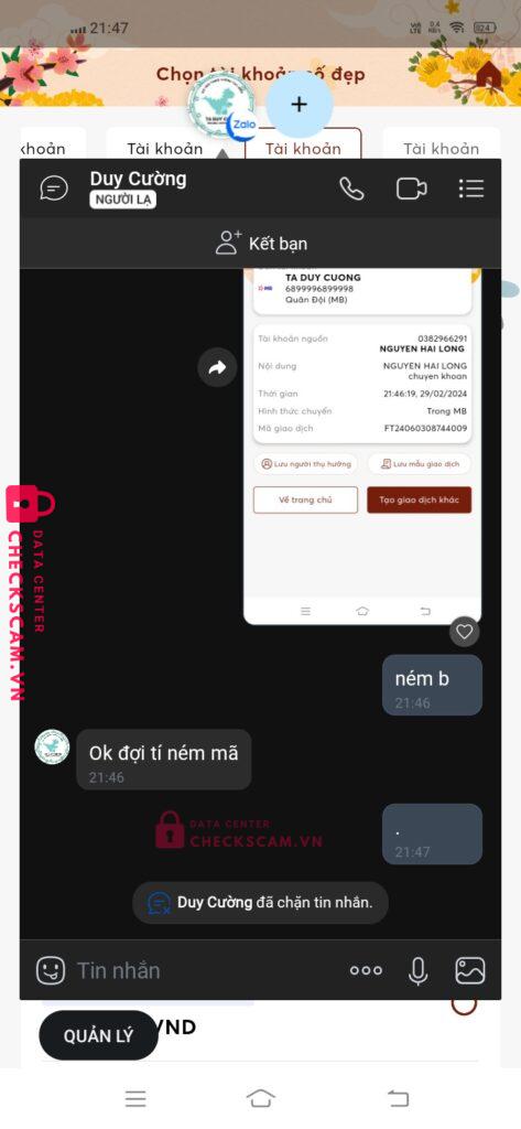 Scammer Alert: TA DUY CUONG Reported: November 16, 2024 Scammer Information Full Name: TA DUY CUONG Payment Gate: MBANK Payment Account: 6899996899998 Category: Marketplace scams Source: Checkscam Evidence Files Report Description tôi đã chọn người này mua stk voucher mà ng này block tôi. Comments Your comment Add Comment No comments yet. Be the first to share your experience with this scammer.