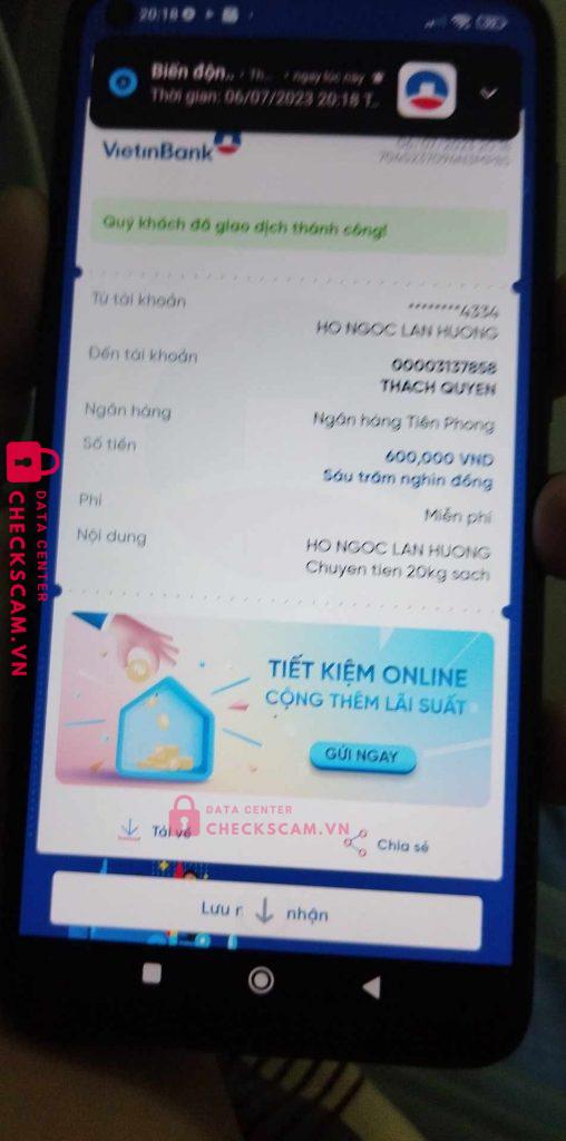 Scammer Alert: Thach quyen Reported: November 16, 2024 Scammer Information Full Name: Thach quyen Payment Gate: Tpbank Payment Account: 00003137858 Category: Marketplace scams Source: Checkscam Evidence Files Report Description Lừa đảo mua bán sách Comments Your comment Add Comment No comments yet. Be the first to share your experience with this scammer.