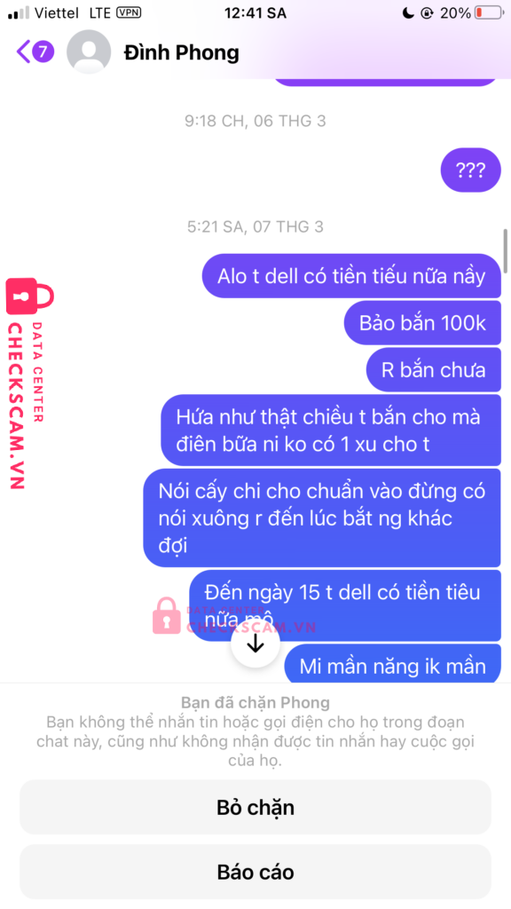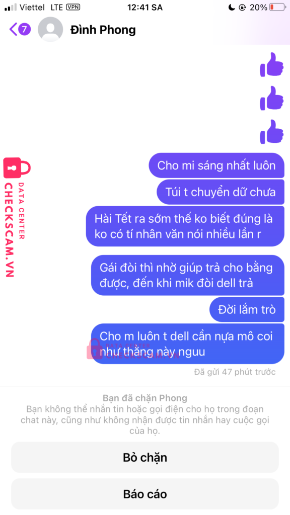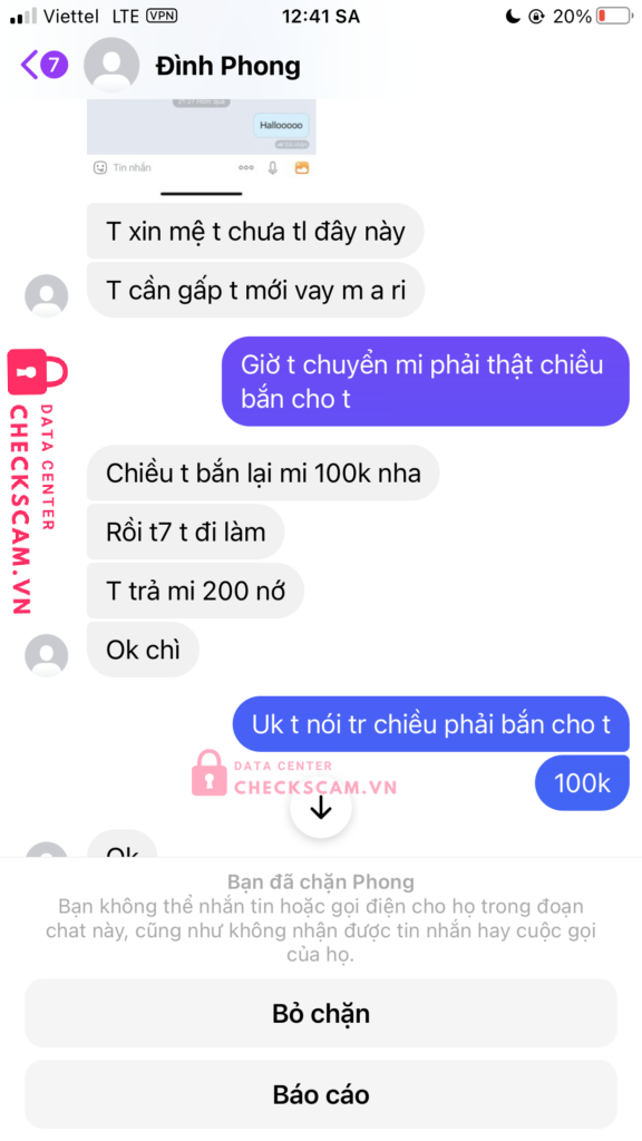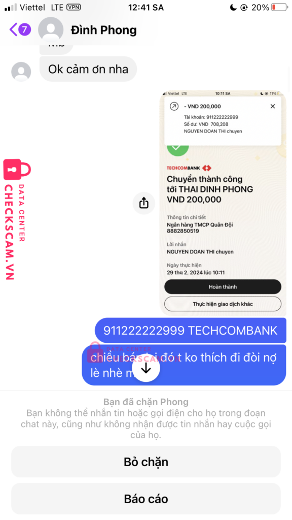 Scammer Alert: Thái Đình Phong Reported: November 16, 2024 Scammer Information Full Name: Thái Đình Phong Payment Gate: MBBank Payment Account: 8882850519 Category: Marketplace scams Source: Checkscam Evidence Files Report Description Vay tiền 200k đòi mãi không chịu trả , bị nó cho vào danh sách hạn chế nên nhắn tin không đòi được ae nào ở nghệ an né thằng này ra nhé Comments Your comment Add Comment No comments yet. Be the first to share your experience with this scammer.