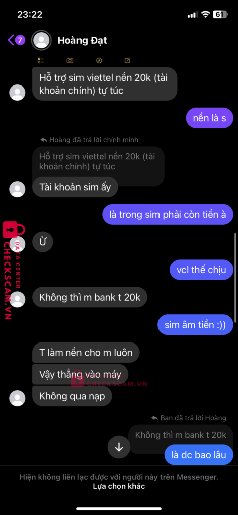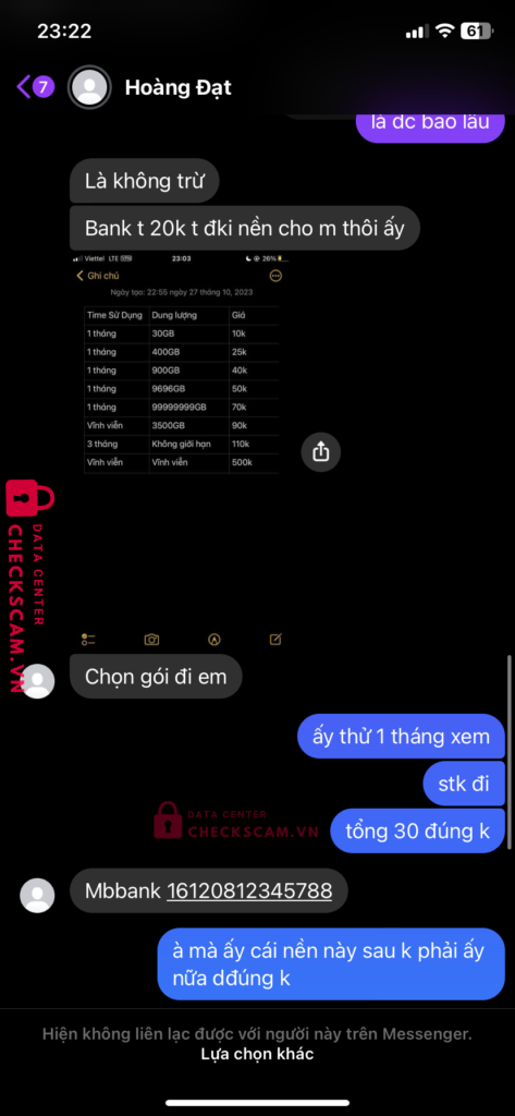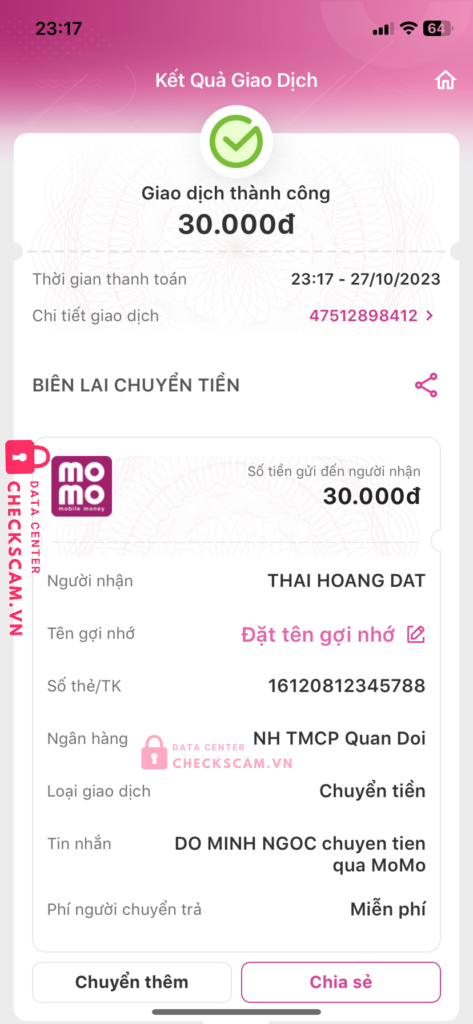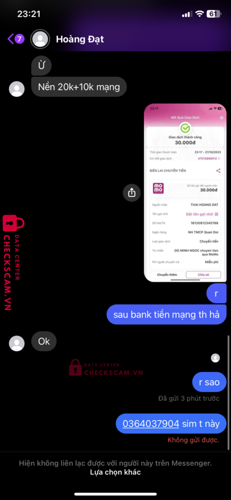 Scammer Alert: THAI HOANG DAT Reported: November 16, 2024 Scammer Information Full Name: THAI HOANG DAT Payment Gate: mb bank Payment Account: 16120812345788 Category: Marketplace scams Source: Checkscam Evidence Files Report Description scam bán 4G viettel ae lưu ý Comments Your comment Add Comment No comments yet. Be the first to share your experience with this scammer.