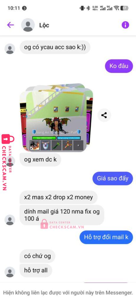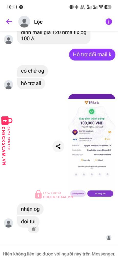 Scammer Alert: THAI HONG NGOC Reported: March 7, 2025 Scammer Information Full Name: THAI HONG NGOC Payment Gate: ACB Payment Account: 36769427 Category: Marketplace scams Source: Checkscam Evidence Files Report Description Mua acc nhưng chuyển tiền xong thì không đưa acc mà chặn fb Comments Your comment Add Comment No comments yet. Be the first to share your experience with this scammer.