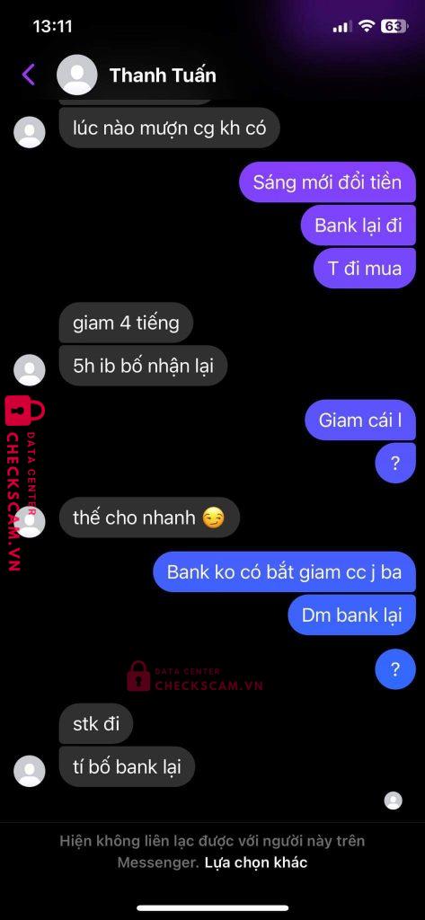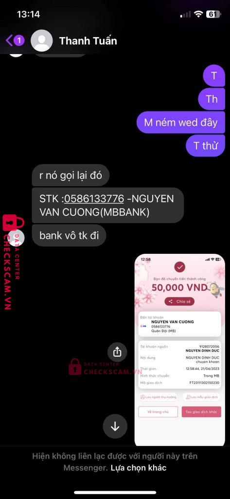 Scammer Alert: Thanh Tuấn Reported: November 16, 2024 Scammer Information Full Name: Thanh Tuấn Phone Number: 0586133776 Payment Gate: Mb Bank Payment Account: 0586133776 Category: Marketplace scams Source: Checkscam Evidence Files Report Description scam 50k mong ad duyệt Comments Your comment Add Comment No comments yet. Be the first to share your experience with this scammer.