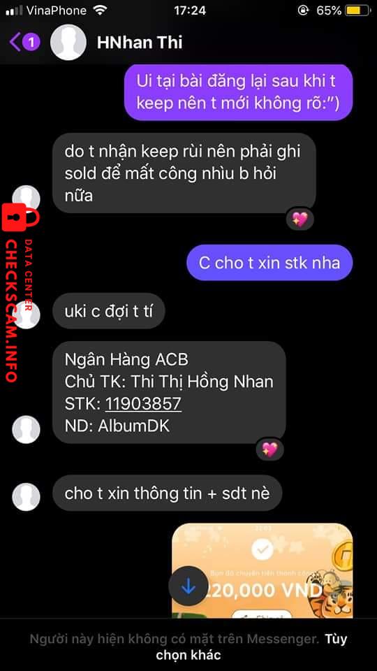 Scammer Alert: Thi Thị Hồng Nhan Reported: November 16, 2024 Scammer Information Full Name: Thi Thị Hồng Nhan Payment Gate: Ngân Hàng ACB Payment Account: 11903857 Category: Marketplace scams Source: Checkscam Evidence Files Report Description Bạn Hnhan Thi có lên bài pass album + card, đến lúc gdich ck xong xui thì xóa tk. Vì phần lớn chưa được gquyet nên bạn này scam nhé. Comments Your comment Add Comment No comments yet. Be the first to share your experience with this scammer.