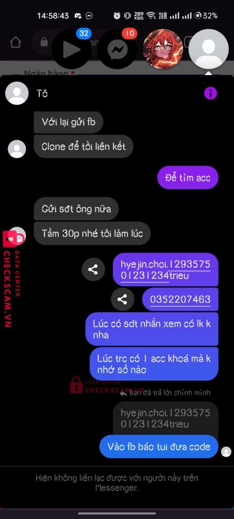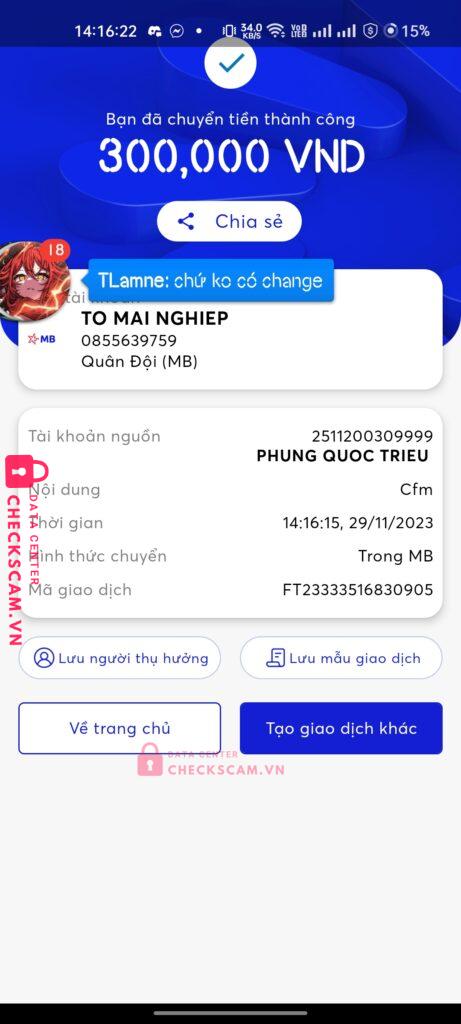 Scammer Alert: TO MAI NGHIEP Reported: November 16, 2024 Scammer Information Full Name: TO MAI NGHIEP Payment Gate: Mb bank Payment Account: 0855639759 Category: Marketplace scams Source: Checkscam Evidence Files Report Description Mua acc cfmobile Ck xong kêu đợi r block Comments Your comment Add Comment No comments yet. Be the first to share your experience with this scammer.