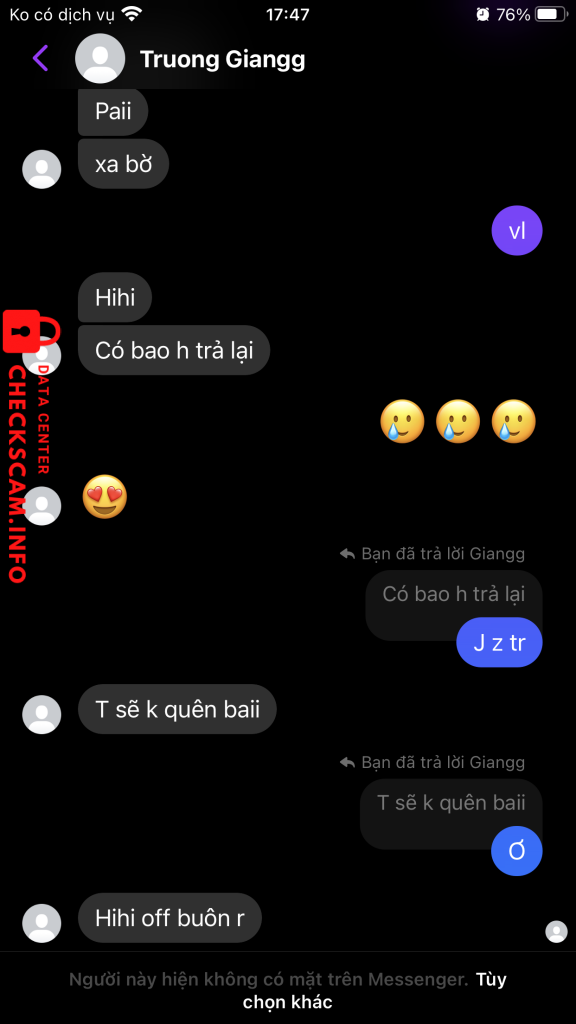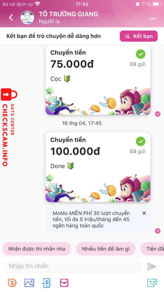 Scammer Alert: Tô Trường Giang Reported: November 16, 2024 Scammer Information Full Name: Tô Trường Giang Phone Number: 0334940776 Payment Gate: Momo Payment Account: 0334940776 Category: Marketplace scams Source: Checkscam Evidence Files Report Description Scam : Bank Tiền xong block Comments Your comment Add Comment No comments yet. Be the first to share your experience with this scammer.