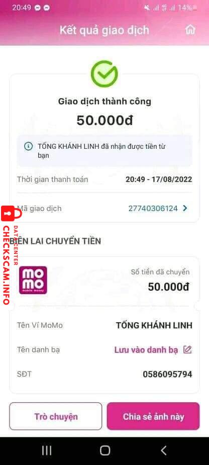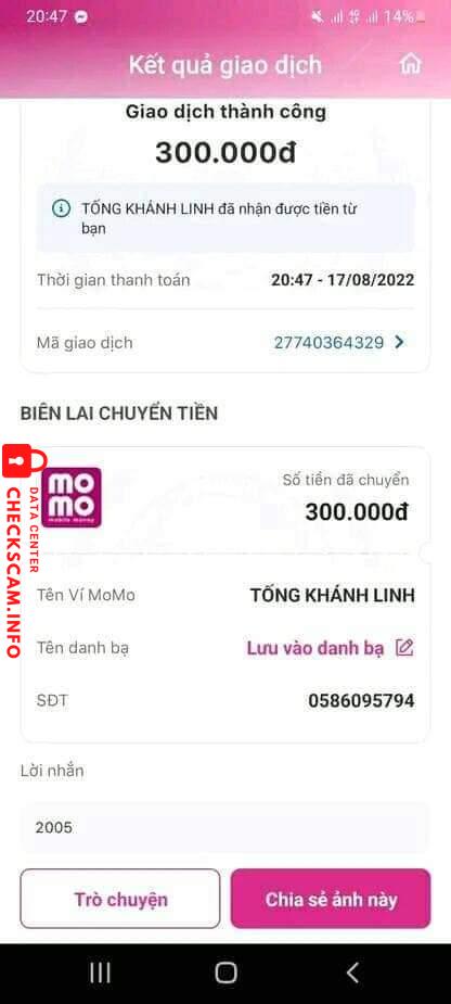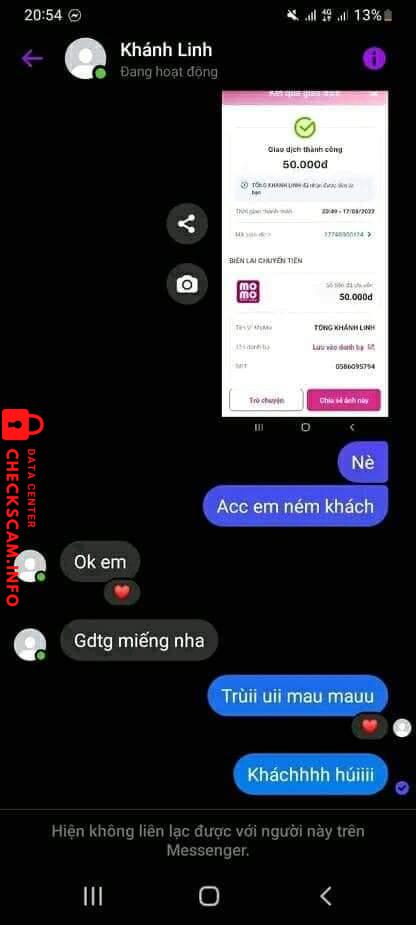 Scammer Alert: Tống Khánh Linh Reported: November 16, 2024 Scammer Information Full Name: Tống Khánh Linh Phone Number: 0586095794 Payment Gate: Momo Payment Account: 0586095794 Category: Marketplace scams Source: Checkscam Evidence Files Report Description Scam acc Comments Your comment Add Comment No comments yet. Be the first to share your experience with this scammer.