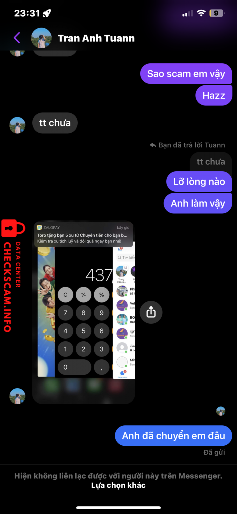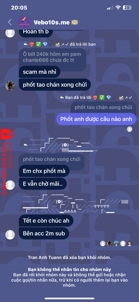 Scammer Alert: Trần Anh Tuấn Reported: November 16, 2024 Scammer Information Full Name: Trần Anh Tuấn Phone Number: 0348719083 Payment Gate: MB BANK Payment Account: 0348719083 Category: Marketplace scams Source: Checkscam Evidence Files Report Description Mọi người chú ý đối tượng này cùng ruột với tống phú doanh và trần hũu hợi Comments Your comment Add Comment No comments yet. Be the first to share your experience with this scammer.