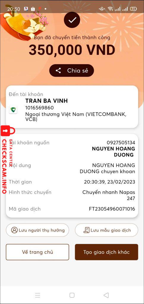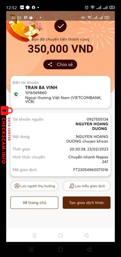Scammer Alert: tran ba vinh Reported: November 16, 2024 Scammer Information Full Name: tran ba vinh Payment Gate: vietcombank Payment Account: 1016569860 Category: Marketplace scams Source: Checkscam Evidence Files Report Description lừa đảo lấy tiền đặt cọc của khách hàng trong mua bán Comments Your comment Add Comment No comments yet. Be the first to share your experience with this scammer.