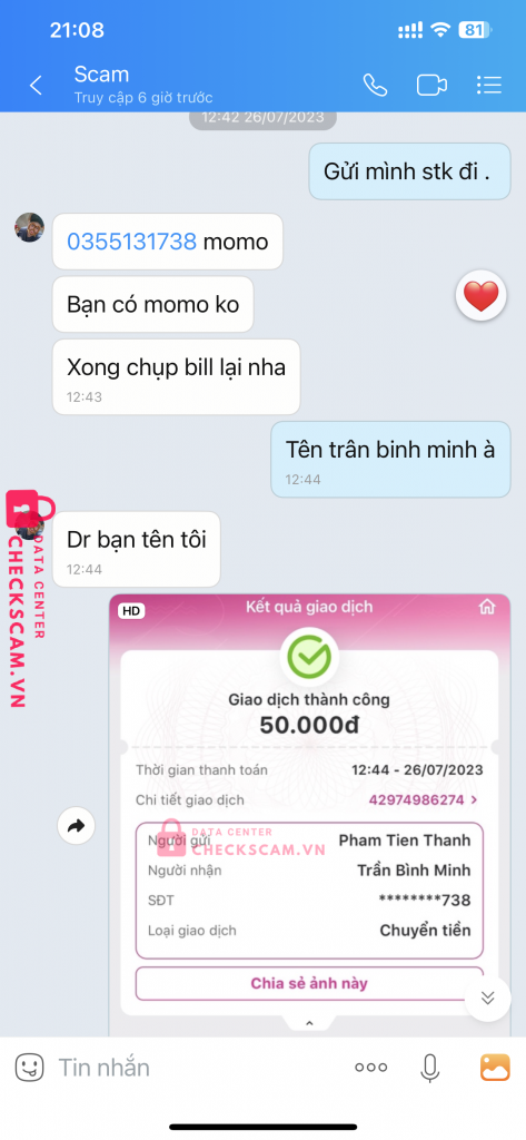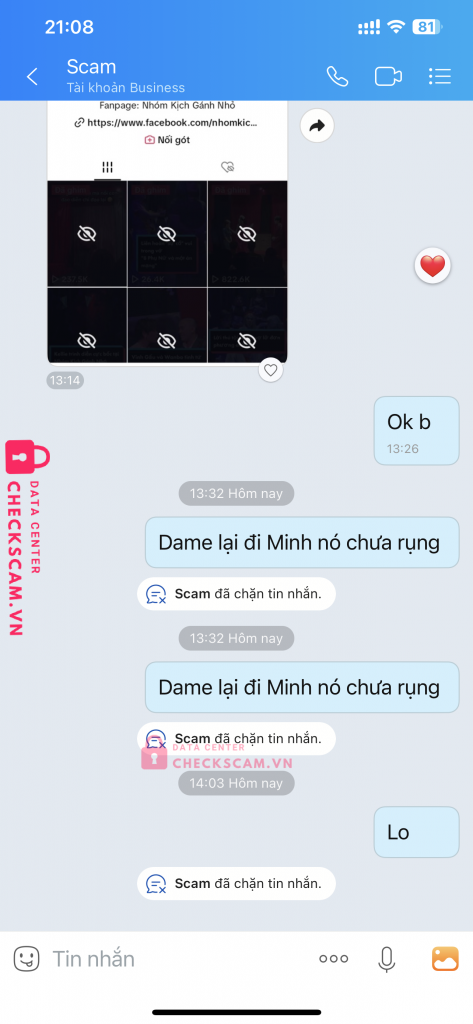 Scammer Alert: Trần Bình Minh Reported: November 16, 2024 Scammer Information Full Name: Trần Bình Minh Phone Number: 0355131738 Payment Gate: Momo Payment Account: 0355131738 Category: Marketplace scams Source: Checkscam Evidence Files Report Description Thằng oắt con này nhận dame tiktok, cọc rồi không làm chặn tin nhắn . Mới tí tuổi đi lừa Comments Your comment Add Comment No comments yet. Be the first to share your experience with this scammer.