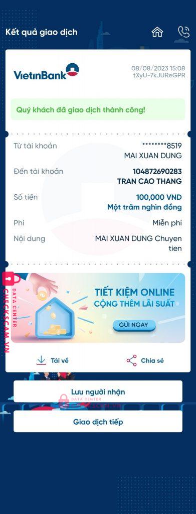 Scammer Alert: Tran Cao Thang Reported: November 16, 2024 Scammer Information Full Name: Tran Cao Thang Payment Gate: Viettinbank Payment Account: 104872690283 Category: Marketplace scams Source: Checkscam Evidence Files Report Description Scam bán laptop trên voz.vn, lừa cọc Comments Your comment Add Comment No comments yet. Be the first to share your experience with this scammer.