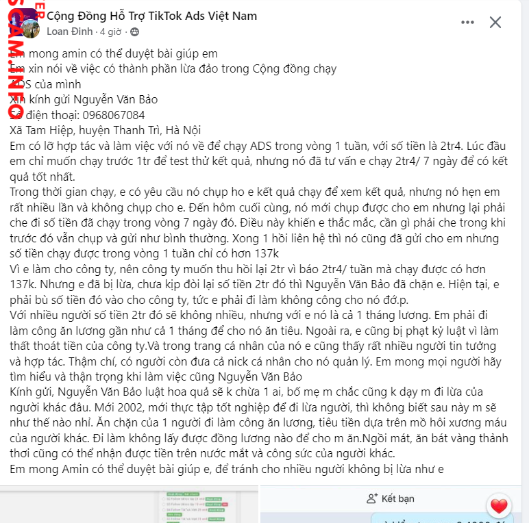 Scammer Alert: TRAN CONG NGO Reported: November 16, 2024 Scammer Information Full Name: TRAN CONG NGO Phone Number: 0968067084 Payment Gate: vcb Payment Account: 1025061170 Category: Marketplace scams Source: Checkscam Evidence Files Report Description scam chạy ads tiktok nội dung như trong ảnh Comments Your comment Add Comment No comments yet. Be the first to share your experience with this scammer.