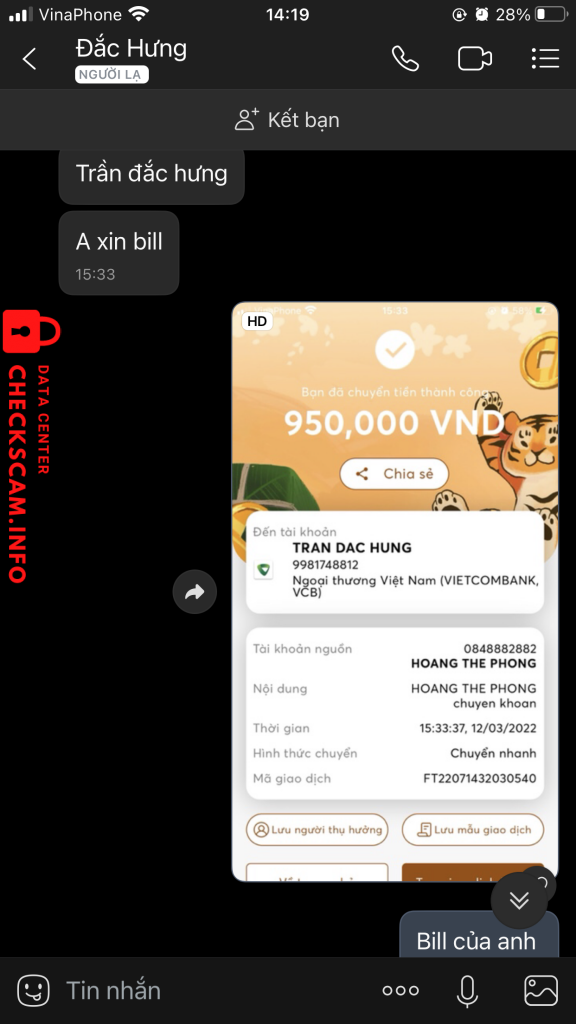 Scammer Alert: Trần Đắc Hưng Reported: November 16, 2024 Scammer Information Full Name: Trần Đắc Hưng Payment Gate: Vietcombank Payment Account: 9981748812 Category: Marketplace scams Source: Checkscam Evidence Files Report Description Lừa đảo buôn bán, cày thuê liên quân Comments Your comment Add Comment No comments yet. Be the first to share your experience with this scammer.