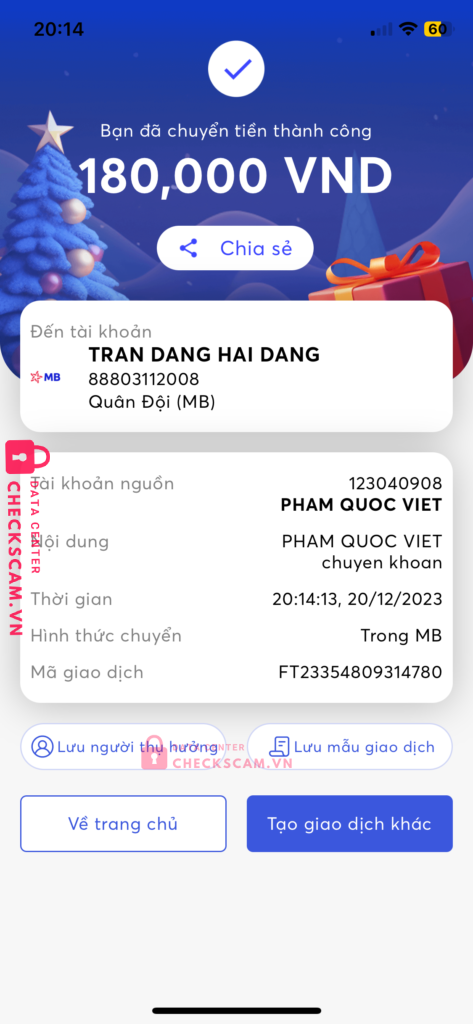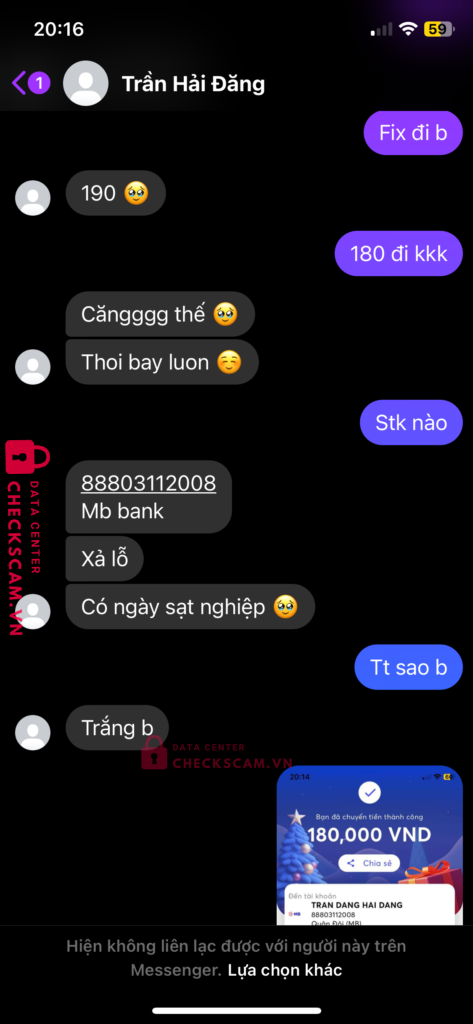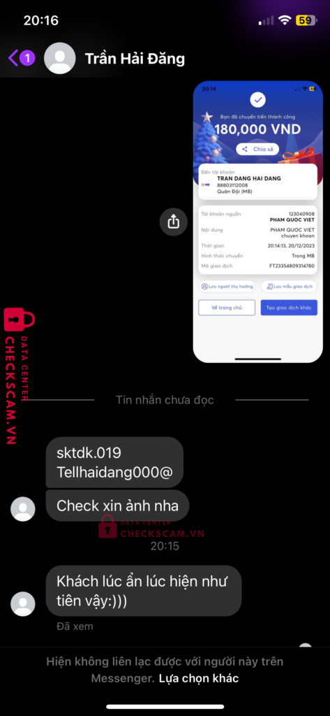 Scammer Alert: TRAN DANG HAI DANG Reported: November 16, 2024 Scammer Information Full Name: TRAN DANG HAI DANG Payment Gate: Mb bank Payment Account: 88803112008 Category: Marketplace scams Source: Checkscam Evidence Files Report Description Tôi lúc đầu checkscam không có vụ lừa đảo của hắn nên tin tưởng chuyển cho hắn 180k và hắn chặn tôi như trong hình Comments Your comment Add Comment No comments yet. Be the first to share your experience with this scammer.