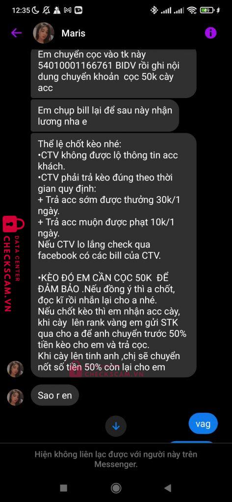 Scammer Alert: TRAN DANG HUY Reported: November 16, 2024 Scammer Information Full Name: TRAN DANG HUY Payment Gate: BIDV Payment Account: 54010001166761 Category: Marketplace scams Source: Checkscam Evidence Files Report Description Giả làm ng tuyển ctv cày thuê, đòi cọc trước Comments Your comment Add Comment No comments yet. Be the first to share your experience with this scammer.