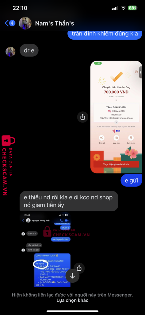 Scammer Alert: Tran Dinh Khiem Reported: May 10, 2025 Scammer Information Full Name: Tran Dinh Khiem Payment Gate: MB Bank Payment Account: tnghia130 Category: Marketplace scams Source: Checkscam Evidence Files Report Description Chuyển tiền 700k và nói rằng sai nội dung . yêu cầu chuyển lại sẽ hoàn . phát hiện scam và block Comments Your comment Add Comment No comments yet. Be the first to share your experience with this scammer.