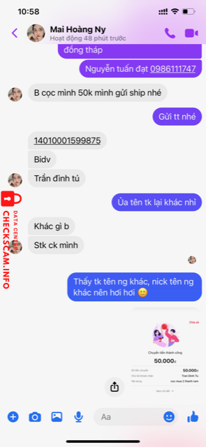 Scammer Alert: Trần Đình Tú Reported: November 16, 2024 Scammer Information Full Name: Trần Đình Tú Payment Gate: BIDV Payment Account: 14010001599875 Category: Marketplace scams Source: Checkscam Evidence Files Report Description Bán hàng lừa đảo, cọc hàng rồi chặn luôn Comments Your comment Add Comment No comments yet. Be the first to share your experience with this scammer.
