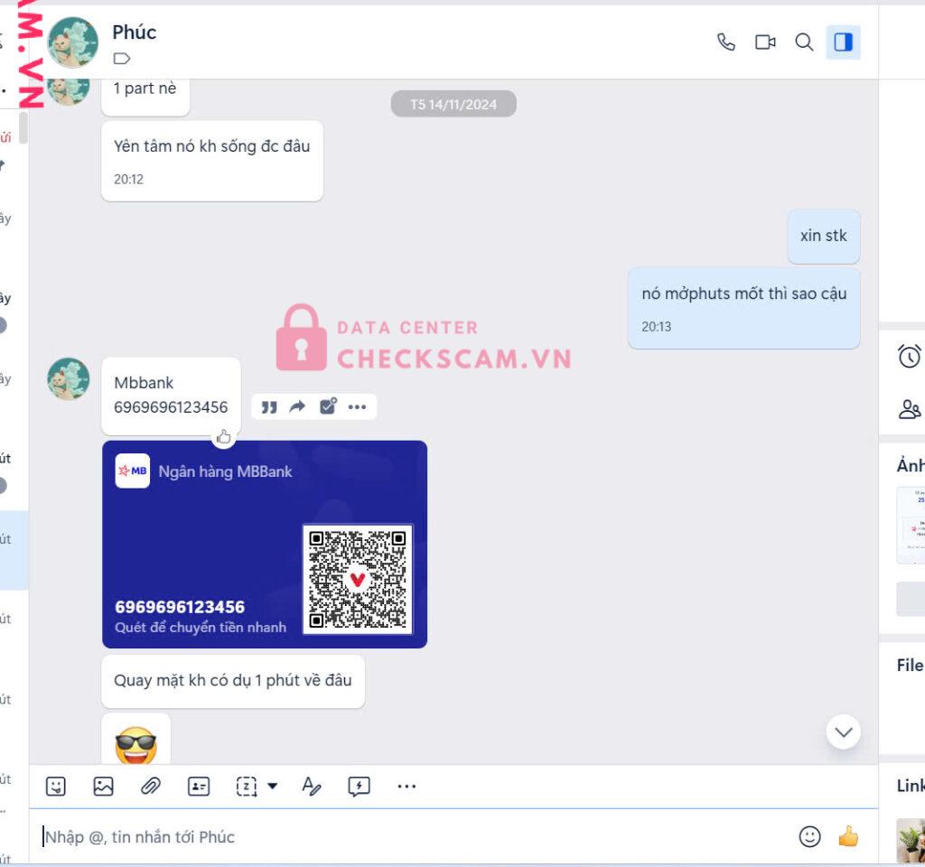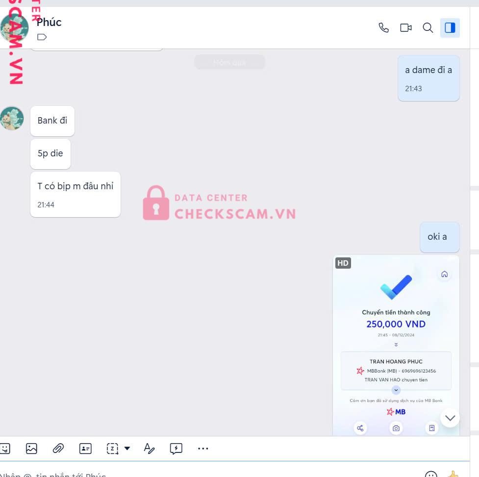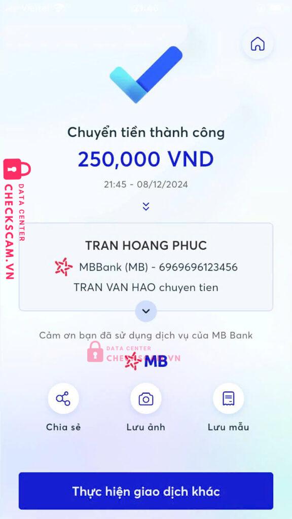 Scammer Alert: TRAN HOANG PHUC Reported: March 7, 2025 Scammer Information Full Name: TRAN HOANG PHUC Payment Gate: MB BANK Payment Account: 6969696123456 Category: Marketplace scams Source: Checkscam Evidence Files Report Description Nhận tiền xong không dame scam lừa đảo ae né stk này ra nhé Comments Your comment Add Comment No comments yet. Be the first to share your experience with this scammer.