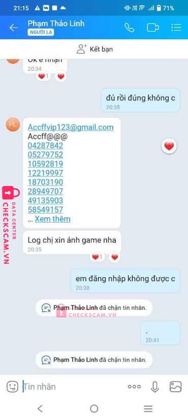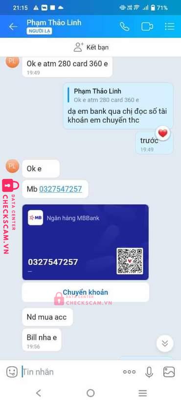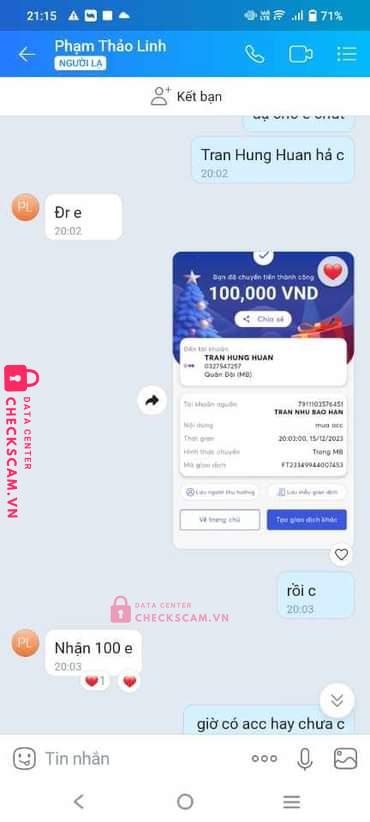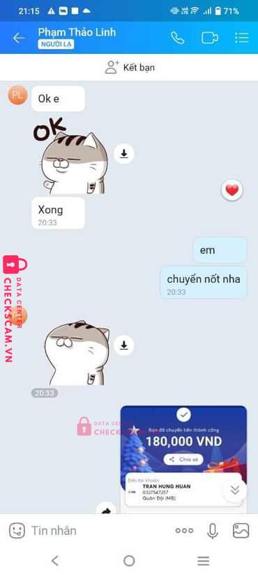 Scammer Alert: TRAN HUNG HUAN Reported: November 16, 2024 Scammer Information Full Name: TRAN HUNG HUAN Payment Gate: Mb bank Payment Account: 0327547257 Category: Marketplace scams Source: Checkscam Evidence Files Report Description Do chủ quan đổi ACC bù trừ nên bị scam mất ACC 2m + 280k nữa coi như bài học Comments Your comment Add Comment No comments yet. Be the first to share your experience with this scammer.