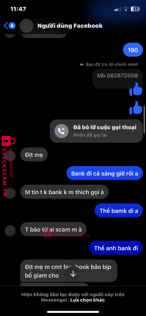 Scammer Alert: Trần Hữu Sáng Reported: May 10, 2025 Scammer Information Full Name: Trần Hữu Sáng Payment Gate: Bivd Payment Account: 8862616158 Category: Marketplace scams Source: Checkscam Evidence Files Report Description Lừa đảo Comments Your comment Add Comment No comments yet. Be the first to share your experience with this scammer.