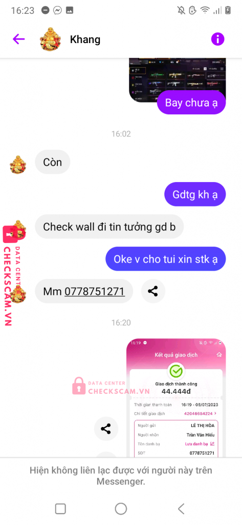 Scammer Alert: Trần Khang Reported: November 16, 2024 Scammer Information Full Name: Trần Khang Payment Gate: Momo Payment Account: 0778751271 Category: Marketplace scams Source: Checkscam Evidence Files Report Description Lừa đảo khách hàng khi mua acc game Comments Your comment Add Comment No comments yet. Be the first to share your experience with this scammer.