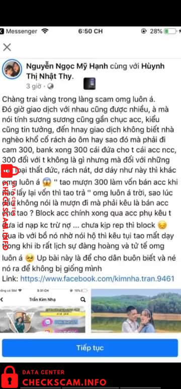 Scammer Alert: Trần Kim Nhạ Reported: November 16, 2024 Scammer Information Full Name: Trần Kim Nhạ Phone Number: 0947646502 Payment Gate: Momo Payment Account: 0776228017 Category: Marketplace scams Source: Checkscam Evidence Files Report Description Scam mua bán acc fai fai Comments Your comment Add Comment No comments yet. Be the first to share your experience with this scammer.