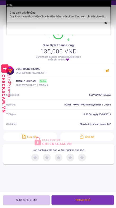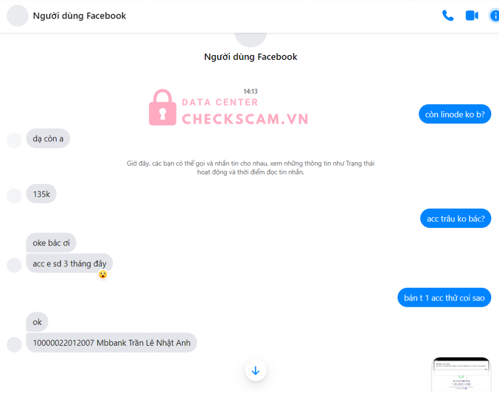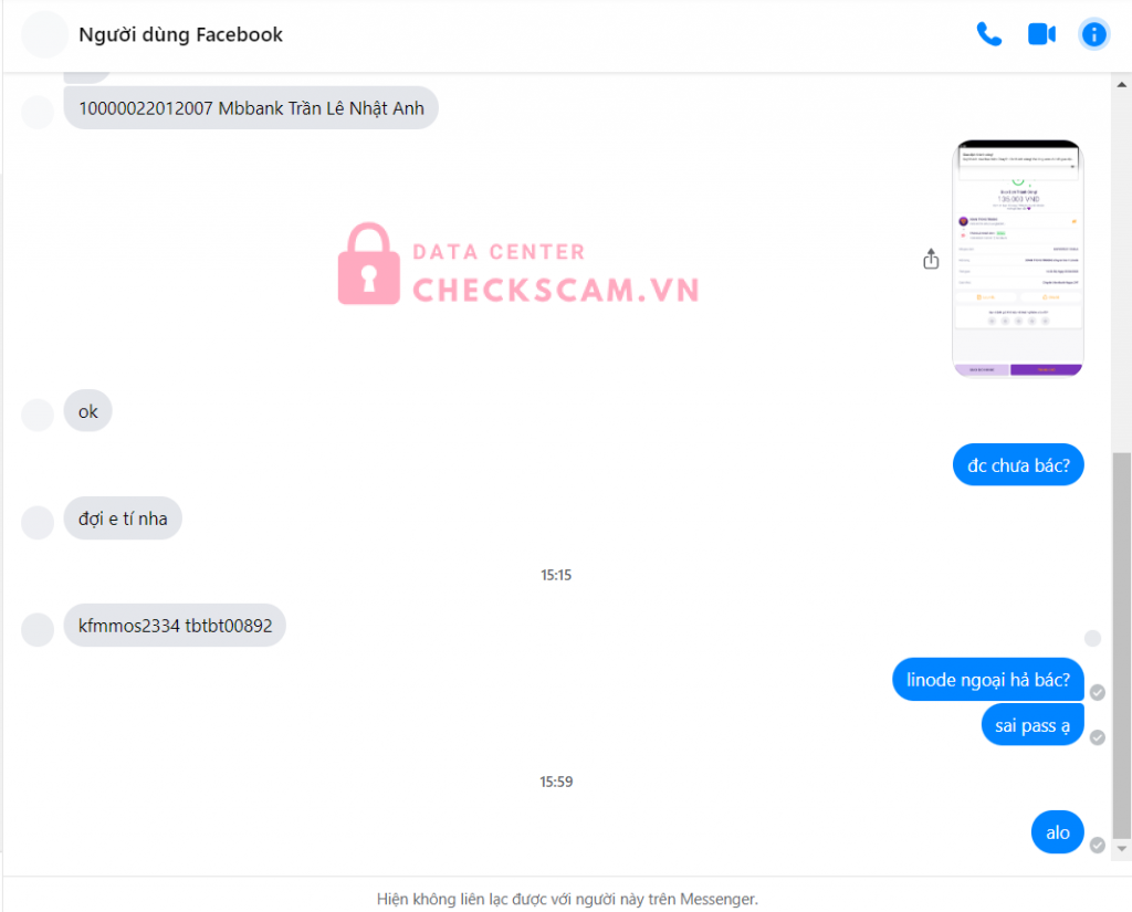 Scammer Alert: Trần Lê Nhật Anh Reported: November 16, 2024 Scammer Information Full Name: Trần Lê Nhật Anh Payment Gate: MBBank Payment Account: 10000022012007 Category: Marketplace scams Source: Checkscam Evidence Files Report Description Lừa đảo bán acc Linode Comments Your comment Add Comment No comments yet. Be the first to share your experience with this scammer.
