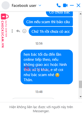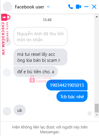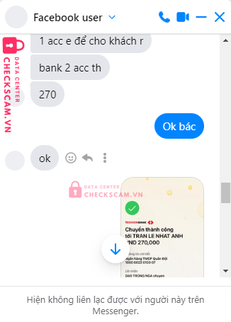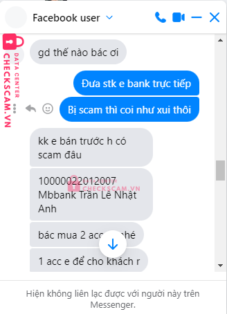 Scammer Alert: Trần Lê Nhật Anh Reported: November 16, 2024 Scammer Information Full Name: Trần Lê Nhật Anh Payment Gate: Mb Bank Payment Account: 10000022012007 Category: Marketplace scams Source: Checkscam Evidence Files Report Description mua 2 nick linode nhưng không giao hàng, block facebook Comments Your comment Add Comment No comments yet. Be the first to share your experience with this scammer.