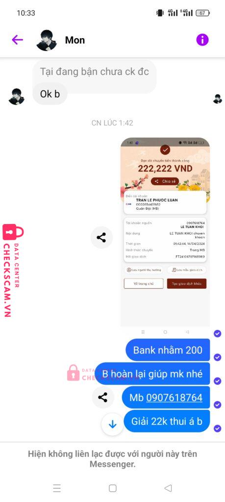 Scammer Alert: TRAN LE PHUOC LUAN Reported: November 16, 2024 Scammer Information Full Name: TRAN LE PHUOC LUAN Payment Gate: MB QUÂN ĐỘI Payment Account: 0000554431652 Category: Marketplace scams Source: Checkscam Evidence Files Report Description Bạn này trúng event bên mình 22k Comments Your comment Add Comment No comments yet. Be the first to share your experience with this scammer.