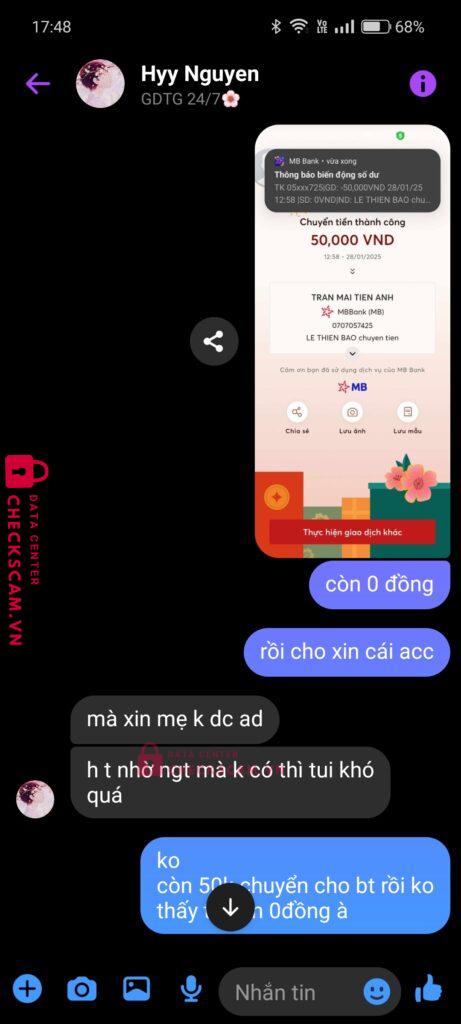 Scammer Alert: Tran Mai Tien Anh Reported: March 7, 2025 Scammer Information Full Name: Tran Mai Tien Anh Payment Gate: mbbank Payment Account: 0707057425 Category: Marketplace scams Source: Checkscam Evidence Files Report Description Comments Your comment Add Comment No comments yet. Be the first to share your experience with this scammer.