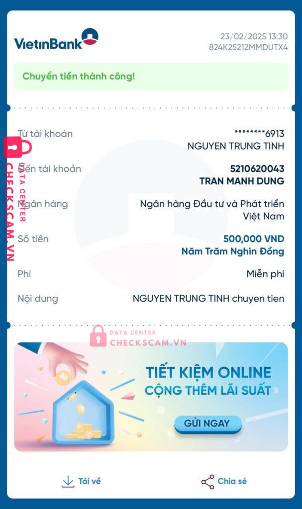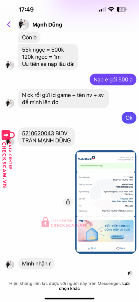 Scammer Alert: Trần Mạnh Dũng Reported: March 7, 2025 Scammer Information Full Name: Trần Mạnh Dũng Payment Gate: BIDV Payment Account: 5210620043 Category: Marketplace scams Source: Checkscam Evidence Files Report Description Lừa mua bán vật phẩm game giá rẻ Comments Your comment Add Comment No comments yet. Be the first to share your experience with this scammer.