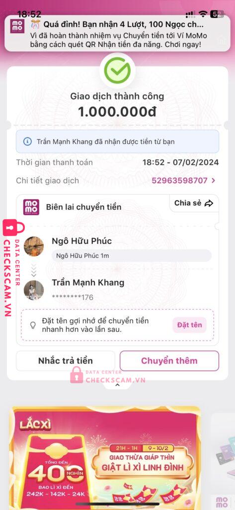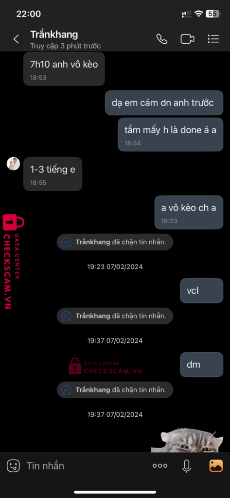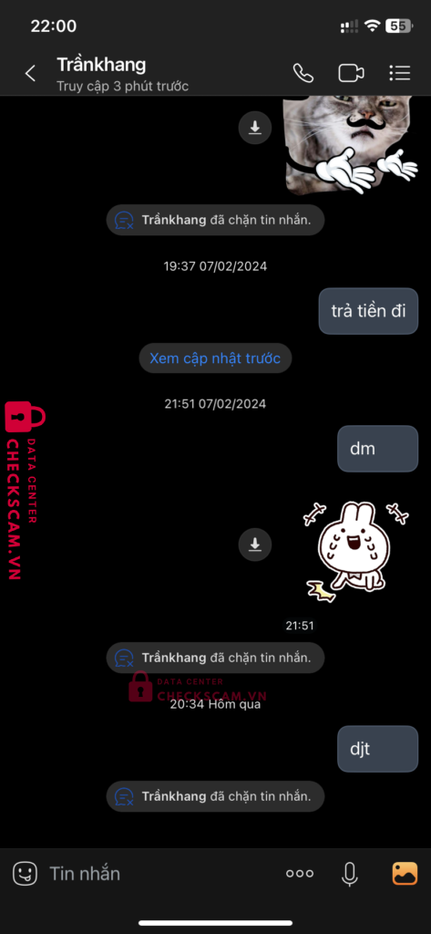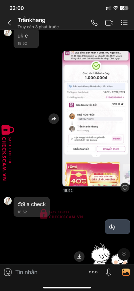 Scammer Alert: Trần Mạnh Khang Reported: November 16, 2024 Scammer Information Full Name: Trần Mạnh Khang Payment Gate: Momo Payment Account: 0899226293 Category: Marketplace scams Source: Checkscam Evidence Files Report Description Lừa đảo kéo tài sỉu đi scam người khác anh em nếu thấy zalo như trên or stk đuôi 176 trần mạnh khang thì né nó ra Comments Your comment Add Comment No comments yet. Be the first to share your experience with this scammer.